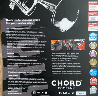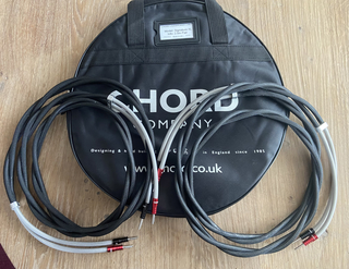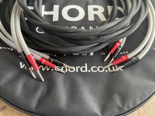 Te koop aangeboden deze in uitstekende staat verkerende luidsprekerkabels van Chord Company; de Signature XL versie met een lengte van 2 x 2,5 meter.