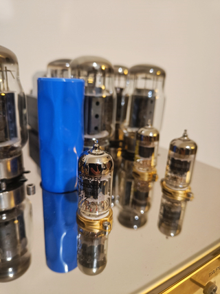 Eindbuizen in goede conditie. Nieuwe stuurbuizen (3 x ECC82/12AU7EH en 2 x ECC83/12AX7EH)