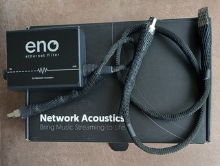 Network Acoustics ENO ethernet filter. Met originele verpakking en een losse1 meter Network Acoustics LAN kabel extra. Network Acoustics kabel van 30 cm zit vast aan het kastje en is dus niet te vervangen. Aan de kabels zitten Telegartner CAT 8.1 connectoren.